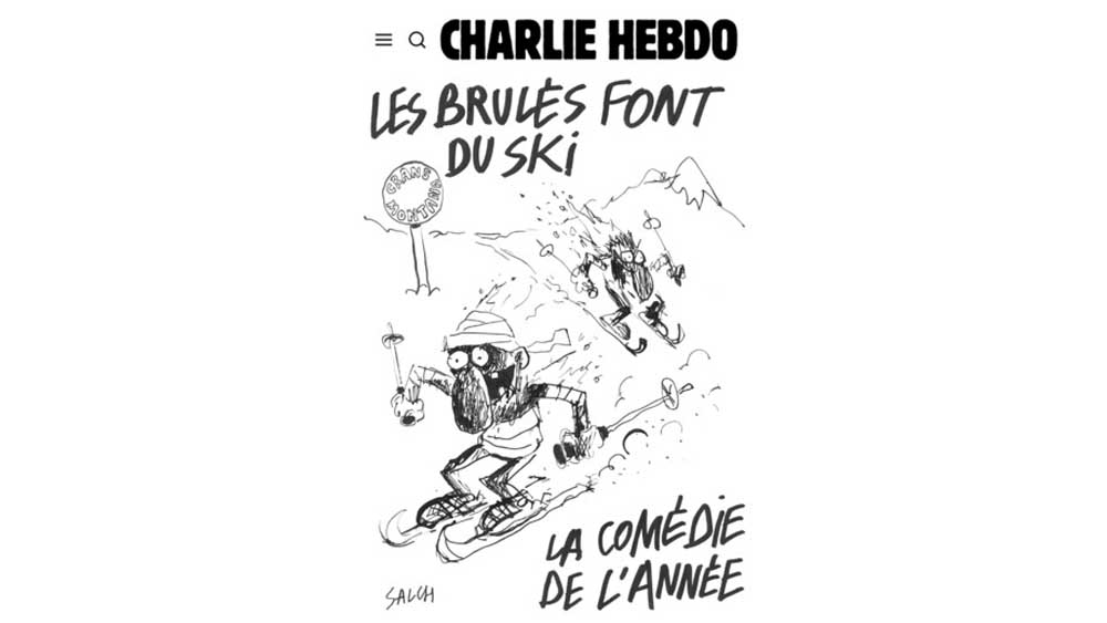 La cosiddetta “vignetta del giorno”, firmata dal disegnatore Salch, mostra due figure caricaturali impegnate a sciare. A colpire non è solo il tratto grafico, ma soprattutto il testo: “Les brûlés font du ski”, accompagnato dalla scritta “La comédie de l’année”. Un linguaggio che rientra nello stile provocatorio della rivista, ma che in questo caso si scontra con un contesto di lutto ancora vivo.