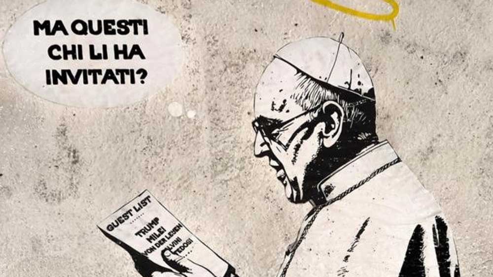Non è solo un’opera d’arte urbana, ma una dichiarazione politica travestita da murales. “Gli invitati” accende i riflettori sul contrasto tra l’immagine pubblica e i valori sostenuti dal Papa – come l’accoglienza dei migranti, la condanna dei massacri a Gaza e la ferma opposizione alla corsa agli armamenti – e le figure che, al contrario, incarnerebbero politiche opposte.